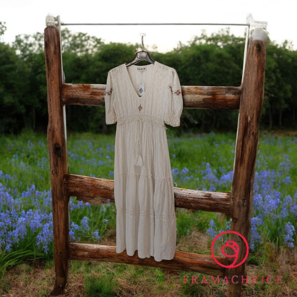 Abito in cotone, mezza manica con paillettes che arricchiscono sul davanti e sul laterale delle maniche.