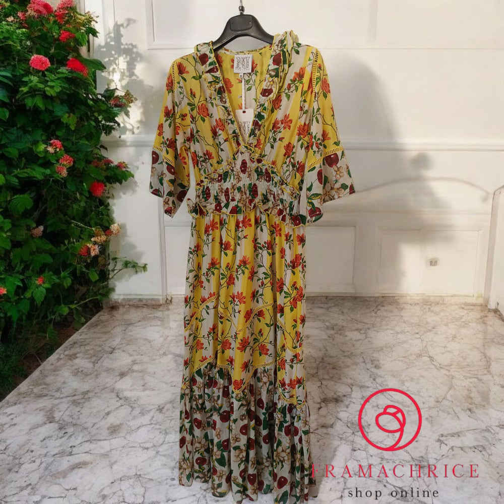 Abito in fresco cotone,fantasia fiori e ciliegie,manica a 3/4.