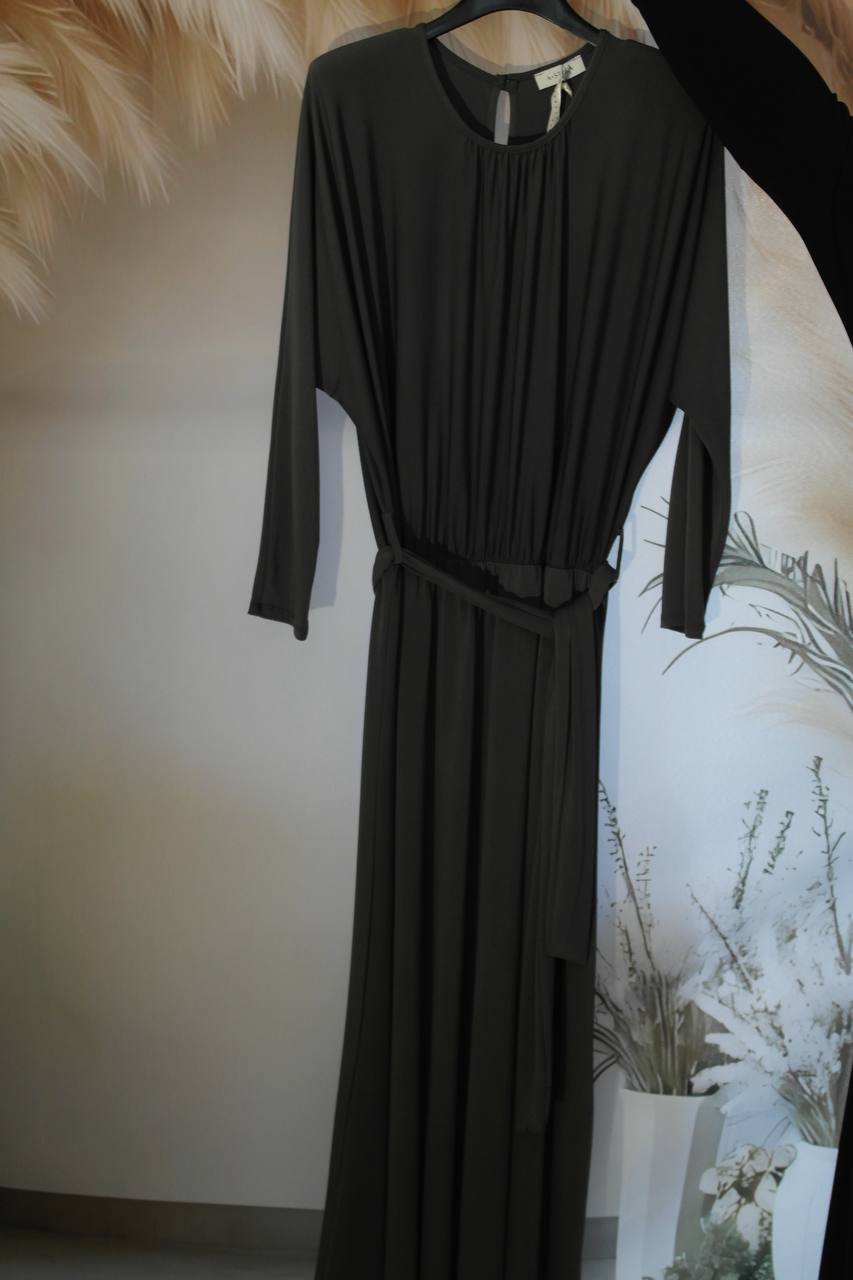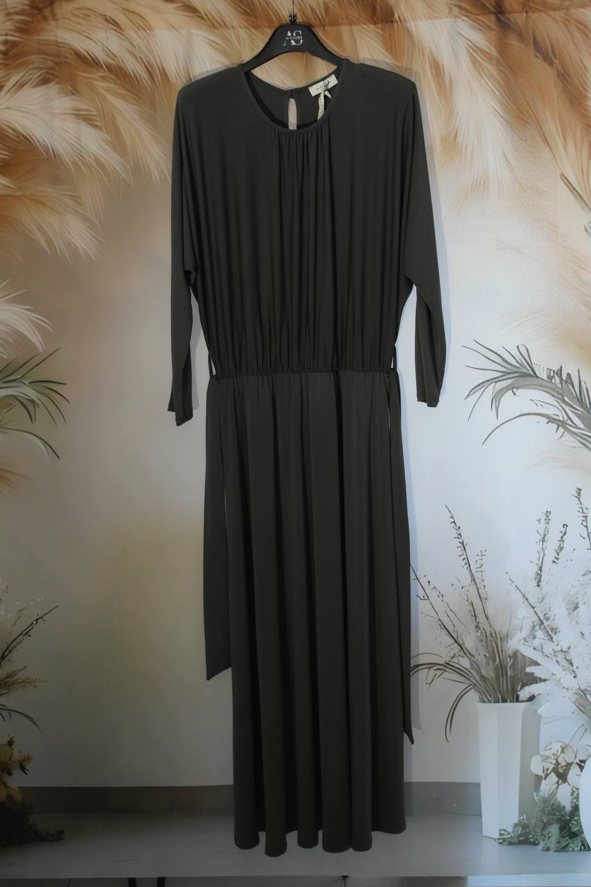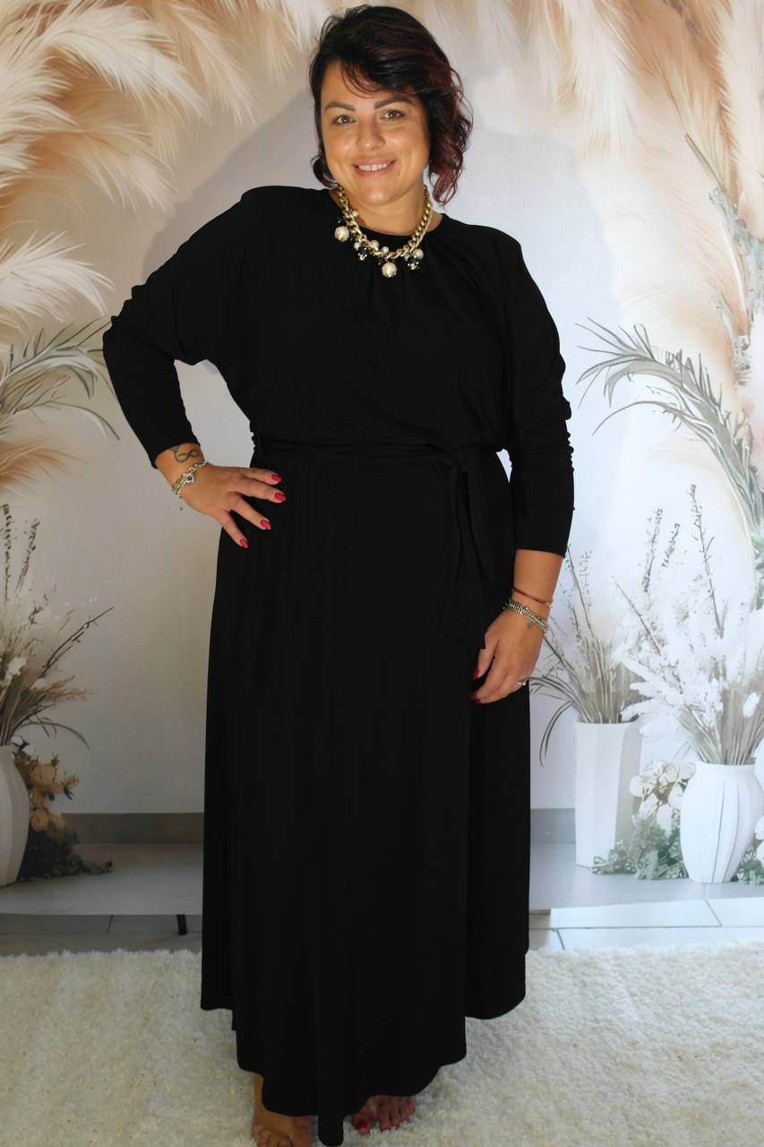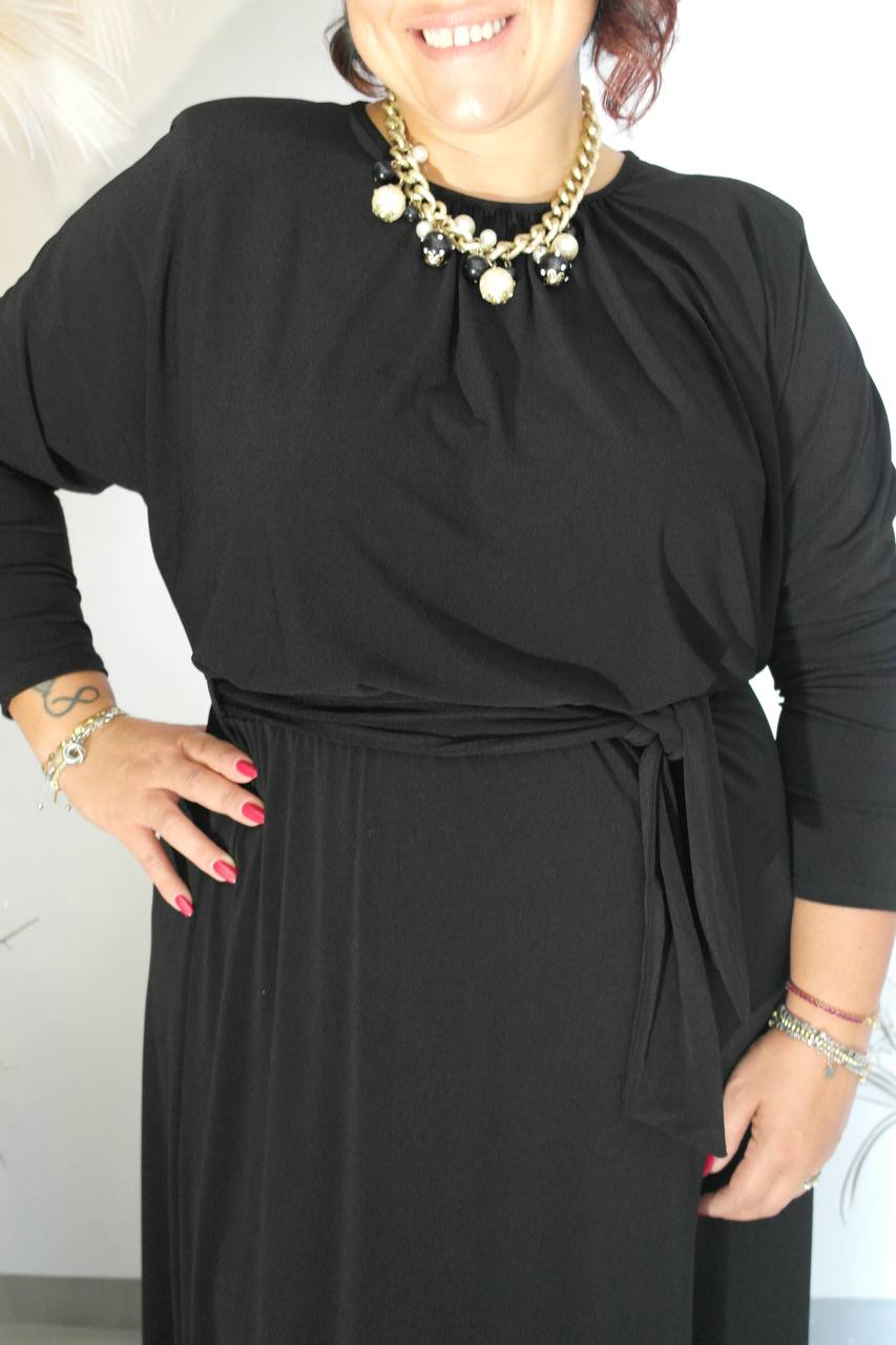 Abito in 95% poliestere,manica lunga,girocollo,cintura in vita in abbinato.Taglia unica ,veste fino ad una 50.