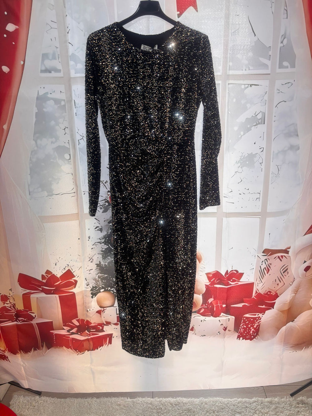 Abito longuette,tutto paiettato sia davanti sia il dietro...manica lunga ,tg unica vestibilità slim veste fino ad tg 38 a una tg 42.