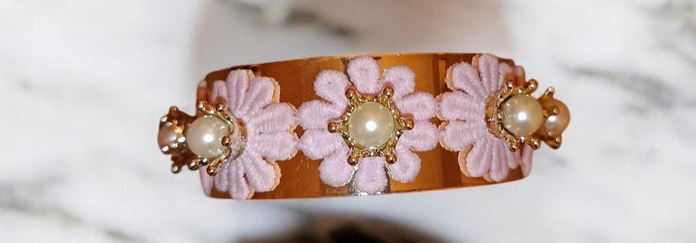 Bracciale in acciaio color oro ,fiore in tessuto rosa e perlina in rilievo.
