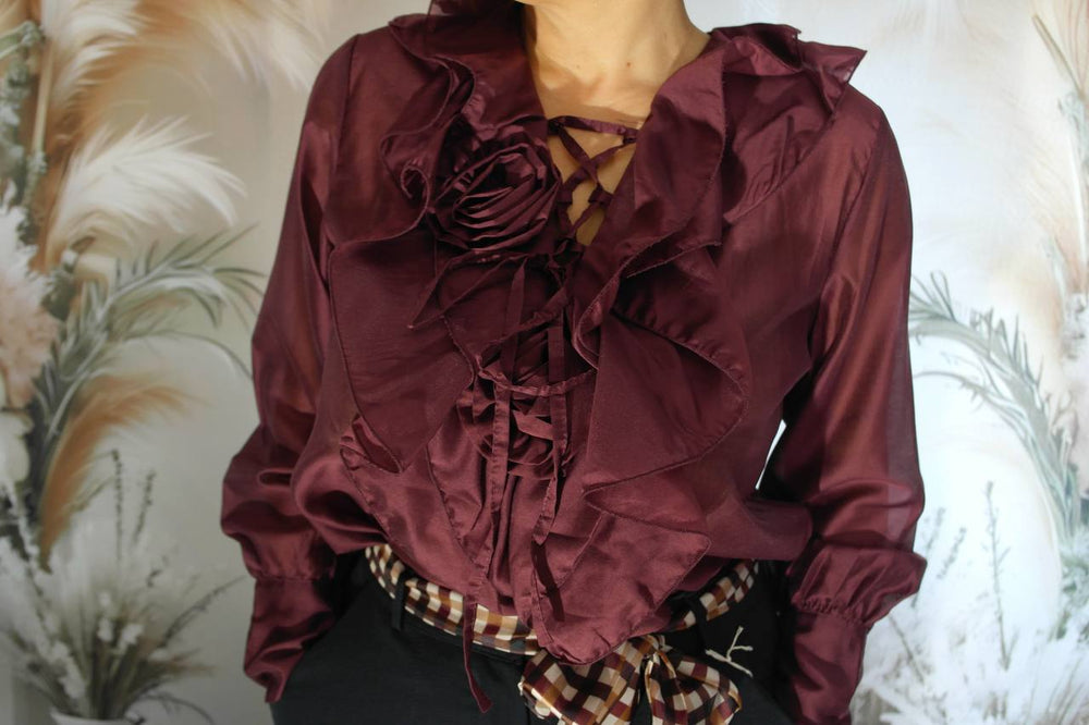 Camicia in viscosa,manica lunga ,dettagli con rose a rilievo e rouche...