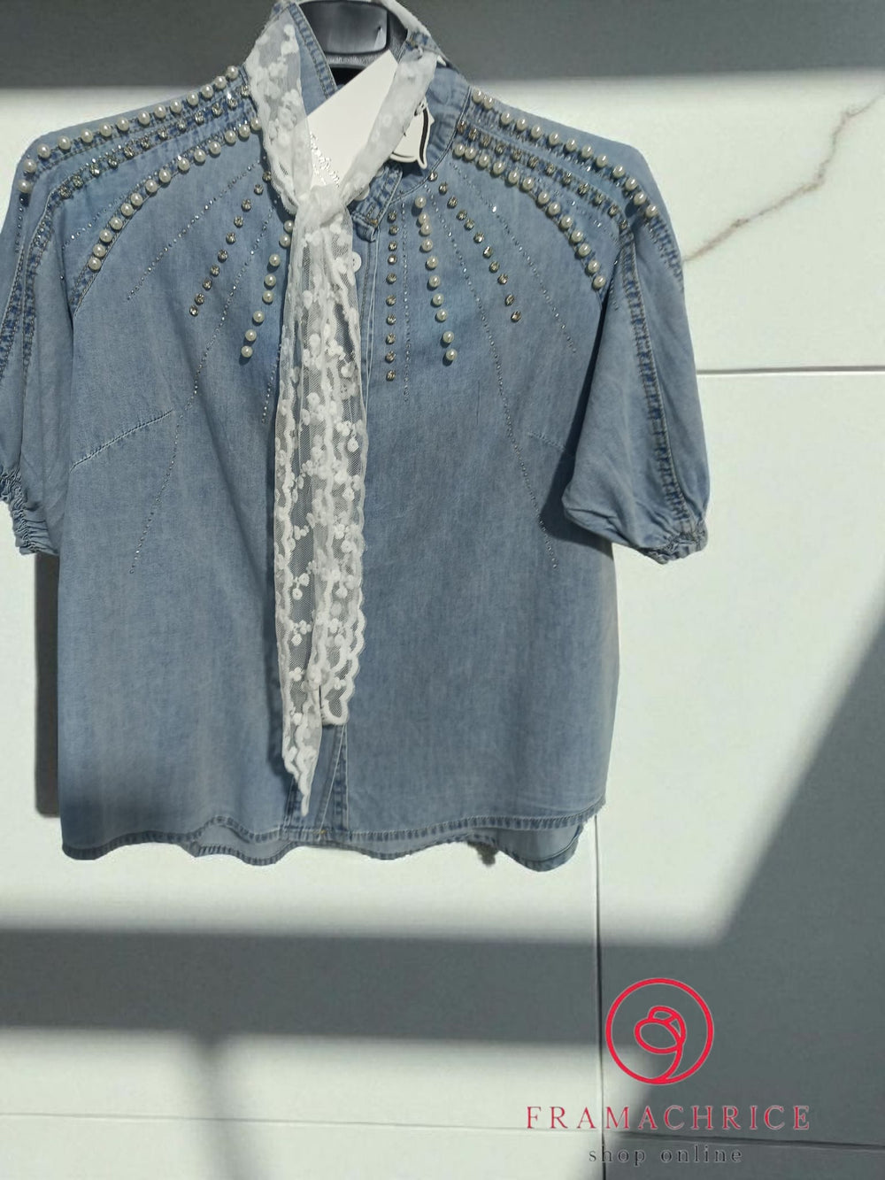 Camicia in cotone,mezza manica , finto jeans,con strass ,perline,e piccolo foulard rimovibile.