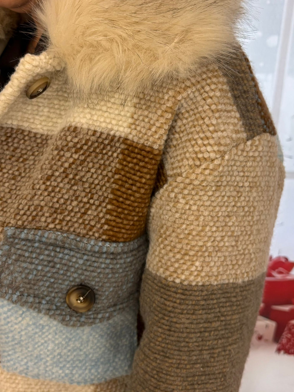 Cappottino Corto con collo di pelliccia ,fantasia a quadri toni terra. E'una tg unica veste fino ad una tg.46.