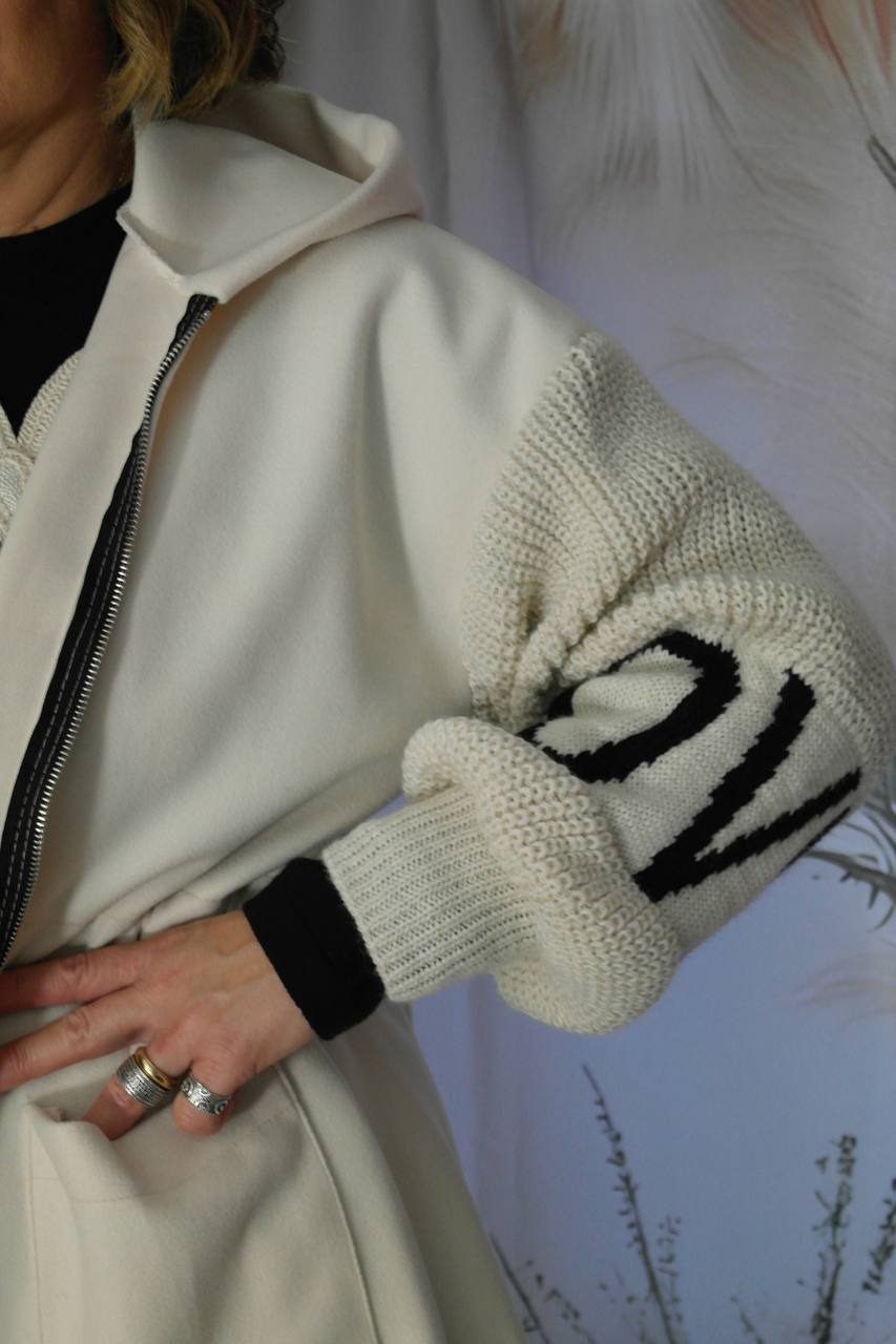 Cappotto in tessuto poliestere e maniche in lana con dettaglio scritta love ai polsi. Cappuccio, chiusura con zip, laccetti in vita, tasche sul davanti.E'una taglia unica veste fino ad una tg 50