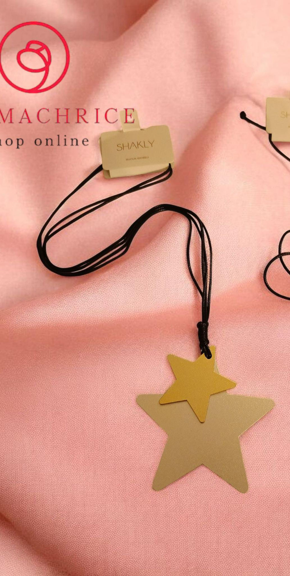 Collana in corda nera e doppia stella pendente in argento e oro satinato.