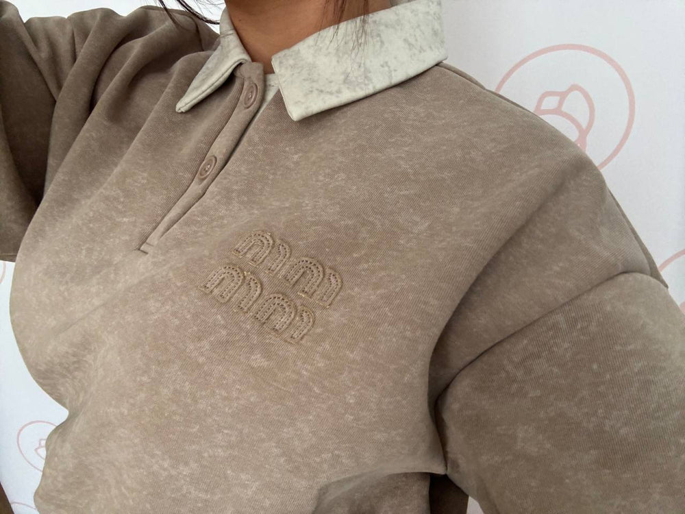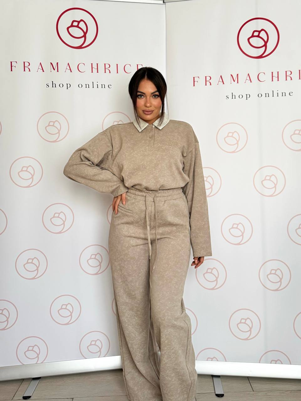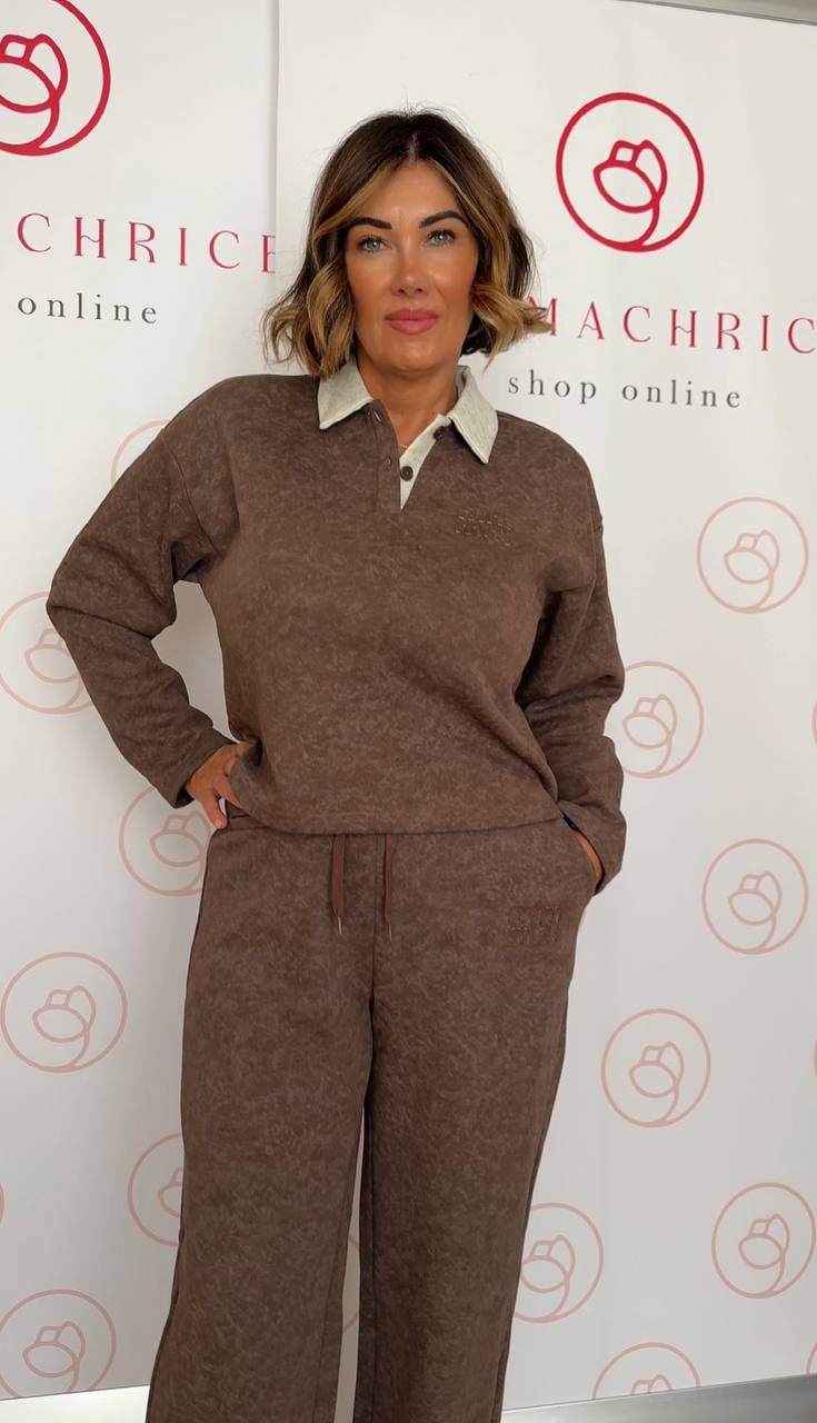 Coordinato taglia unica, composto da pantalone tuta elastico e laccetto in vita e felpa manica lunga con colletto a contrasto e 2 bottoni.