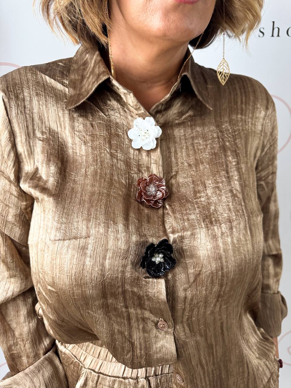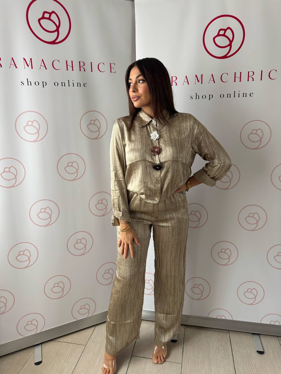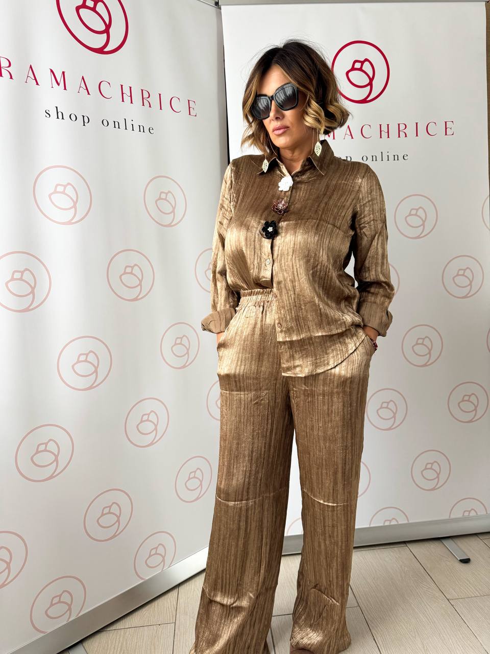 Coordinato composto da pantalone elastico in vita e camicia con bottoni e dettagli fiore sul davanti.