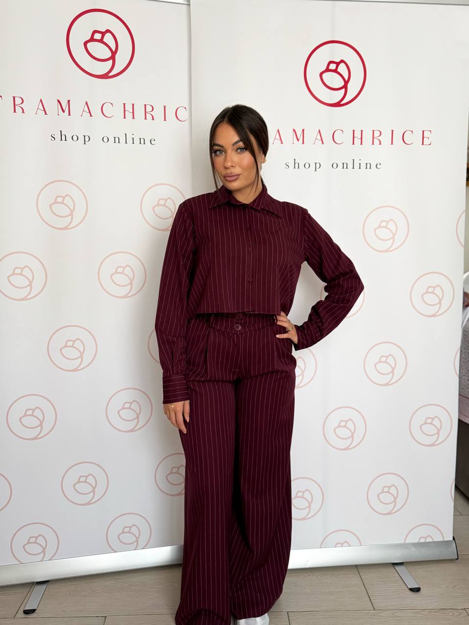 Coordinato composto da pantalone palazzo e camicia in coordinato in bordeaux e righe .