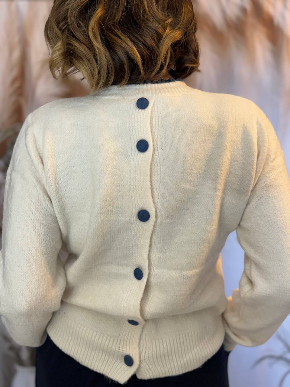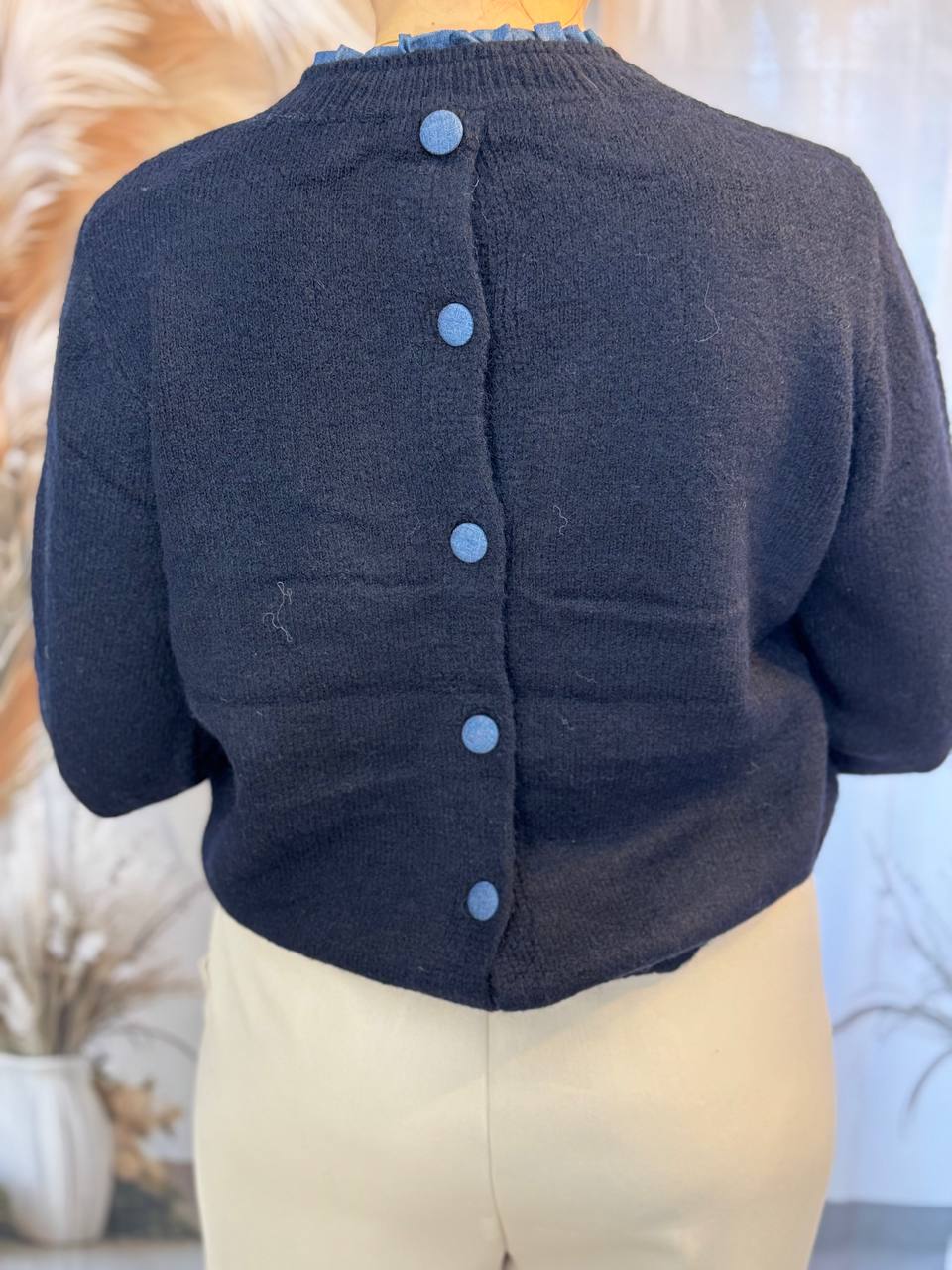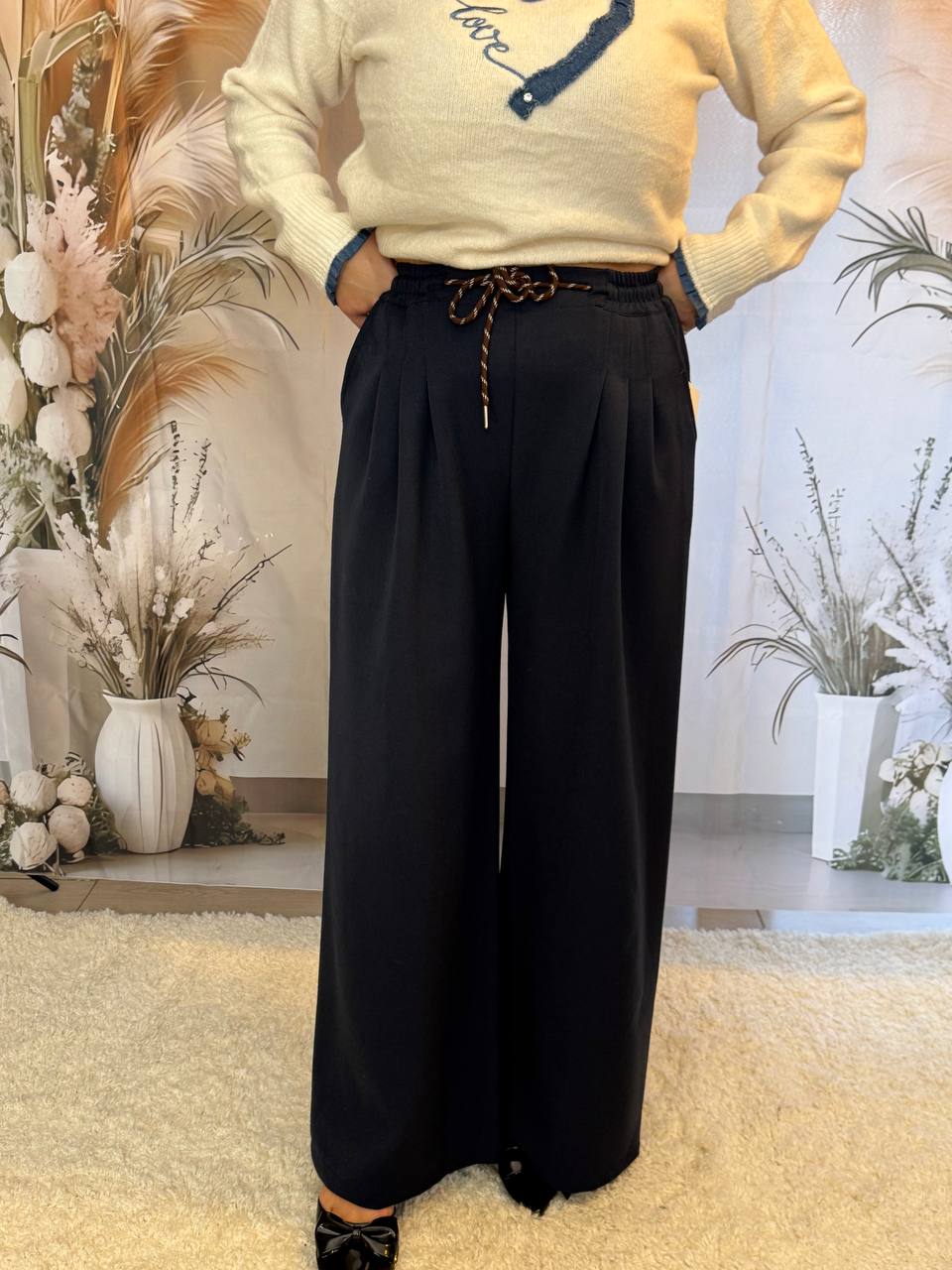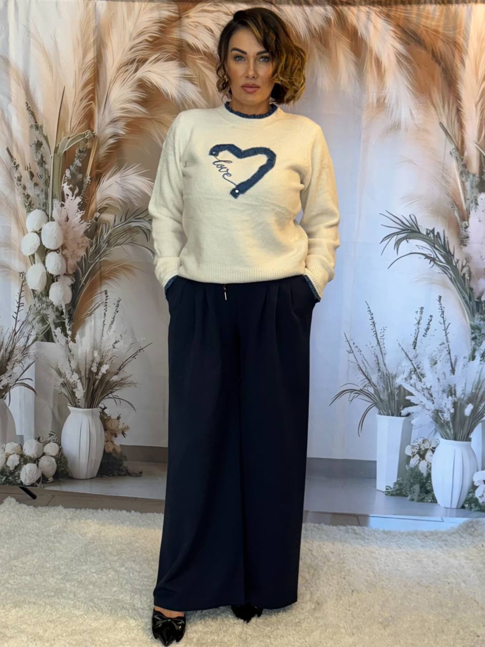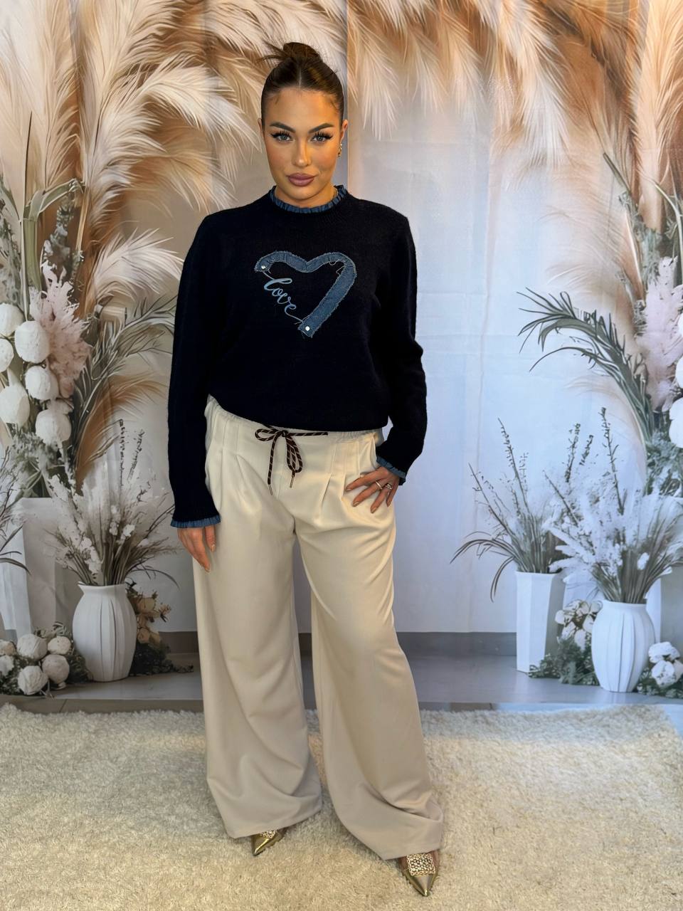 Coordinato composto da pantalone tinta unita, in doppio cotone, con laccetto e elastico in vita. La sua maglia di lana rasata con dettaglio cuore sul davanti e scritta love, colletto e polsini dettaglio rouche in jeans.E come ultima chicca bottoni come chiusura dietro .E' una taglia unica veste fino ad una tg 48