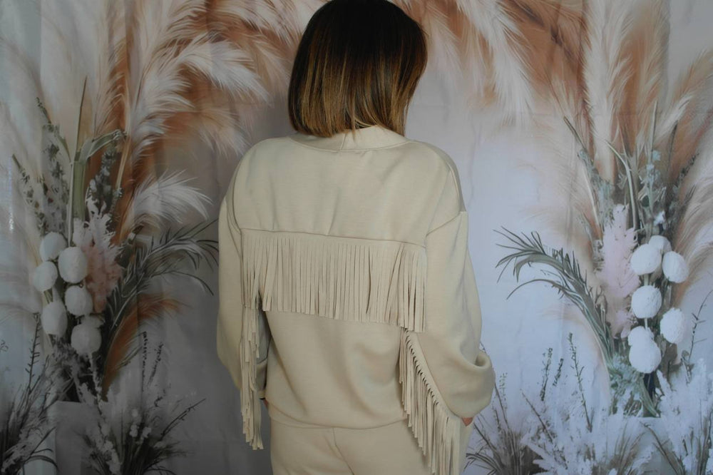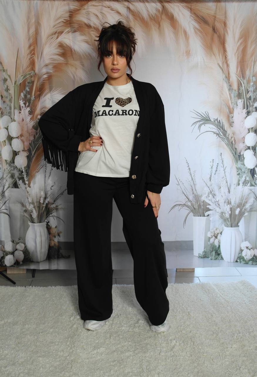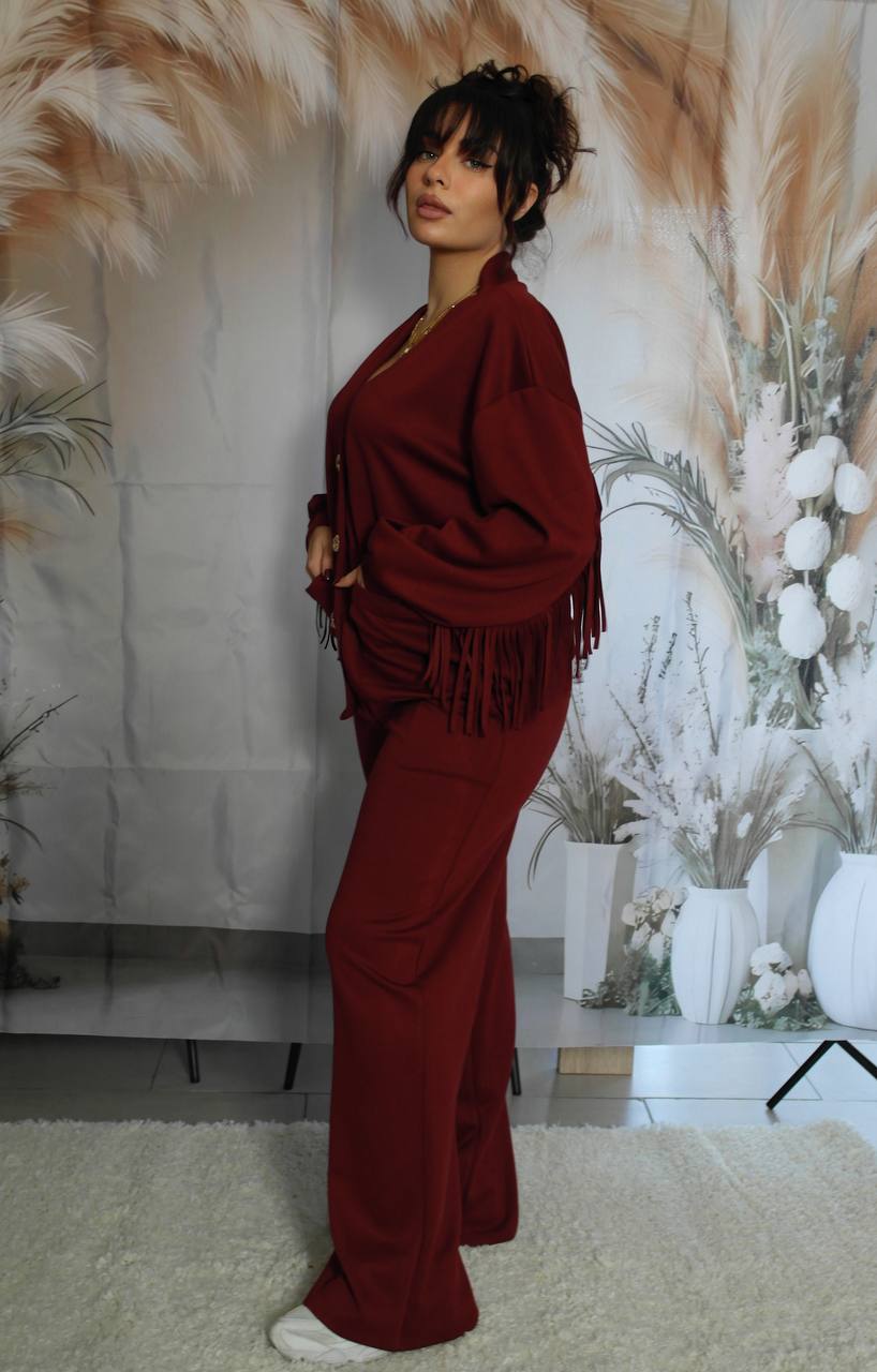 Un coordinato bello,sportivo,versatile e volendo anche elegante.Composto dal suo pantalone palazzo felpato ed elastico e'una taglia unica ,veste fino ad una tg 52. in coordinato la sua maglia aperta con bottoni oro,tasche e frange sul lato posteriore e sulle maniche.sempre felpata come il pantalone ,taglia unica veste anche lei fino ad una taglia 52.