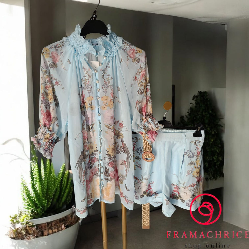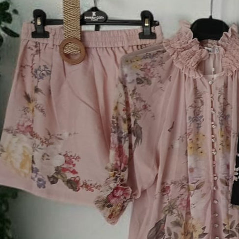 Coordinato in georgette in seta,mezza manica composto da bermuda e camicia con bottoncini gioiello,cintura incorporata.