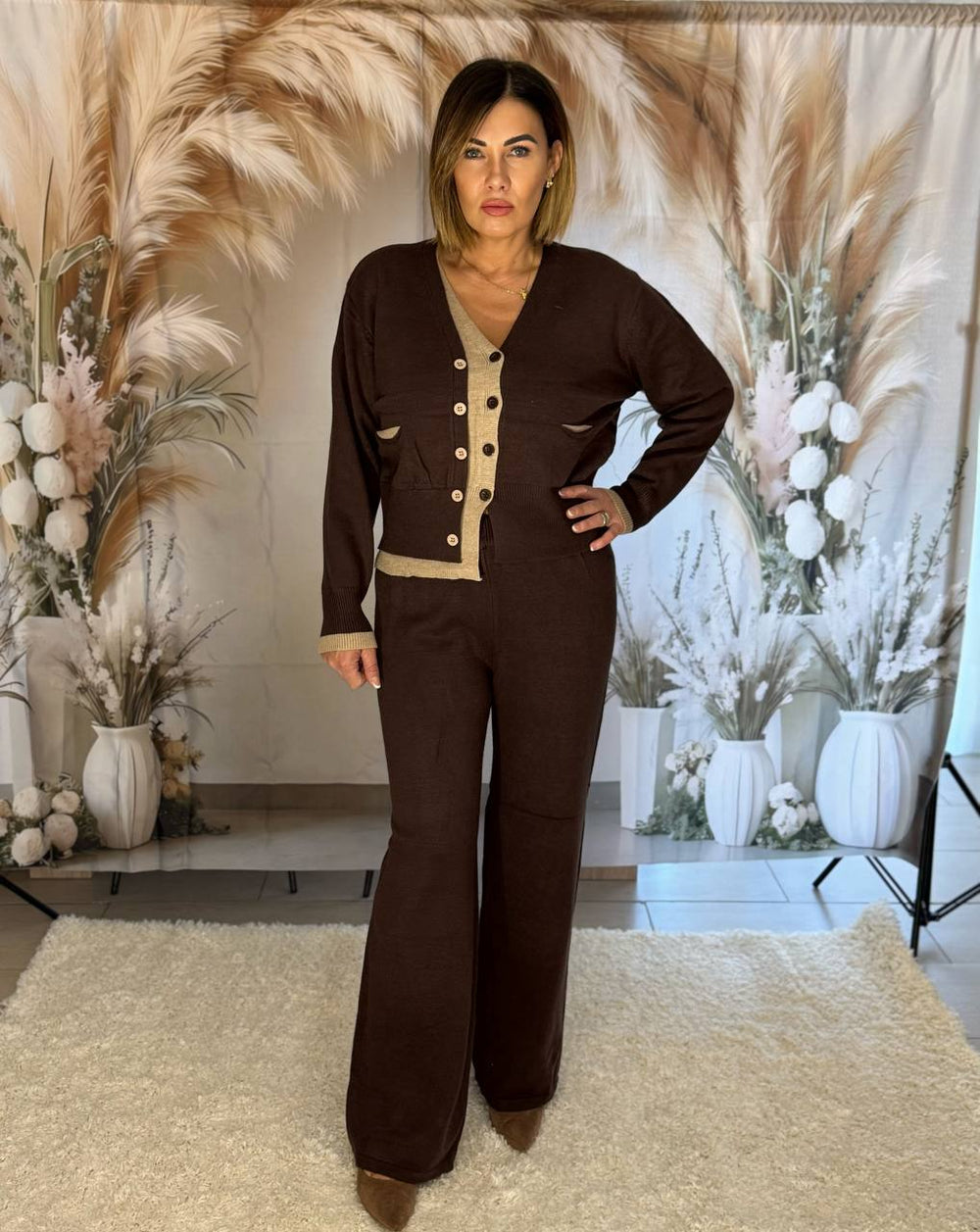 Coordinato composto da pantalone palazzo e maglia bicolor.Tessuto in maglina elasticizzata in poliestere e cashmere. E' una taglia unica veste fino ad una tg 46.