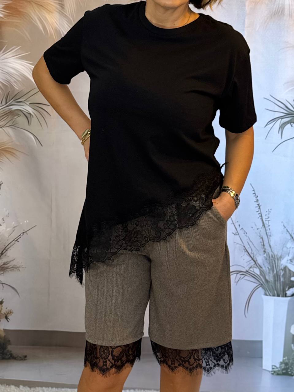 Coordinato composto da giacca ,bermuda, con dettagli ricamo sulla giacca e sul bordo del pantaloncino e t shirt in abbinato o nella variante nera o nella variante bordeux .E'una taglia unica veste fino ad una taglia 46.