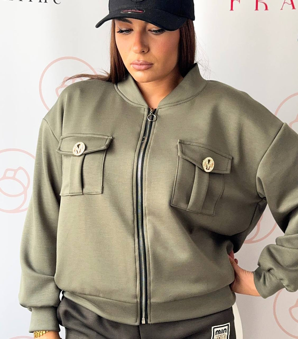 Giubbino in poliestere, chiusura zip e finte taschine sul davanti,dettaglio bottone oro.Taglia unica veste fino ad una 48.