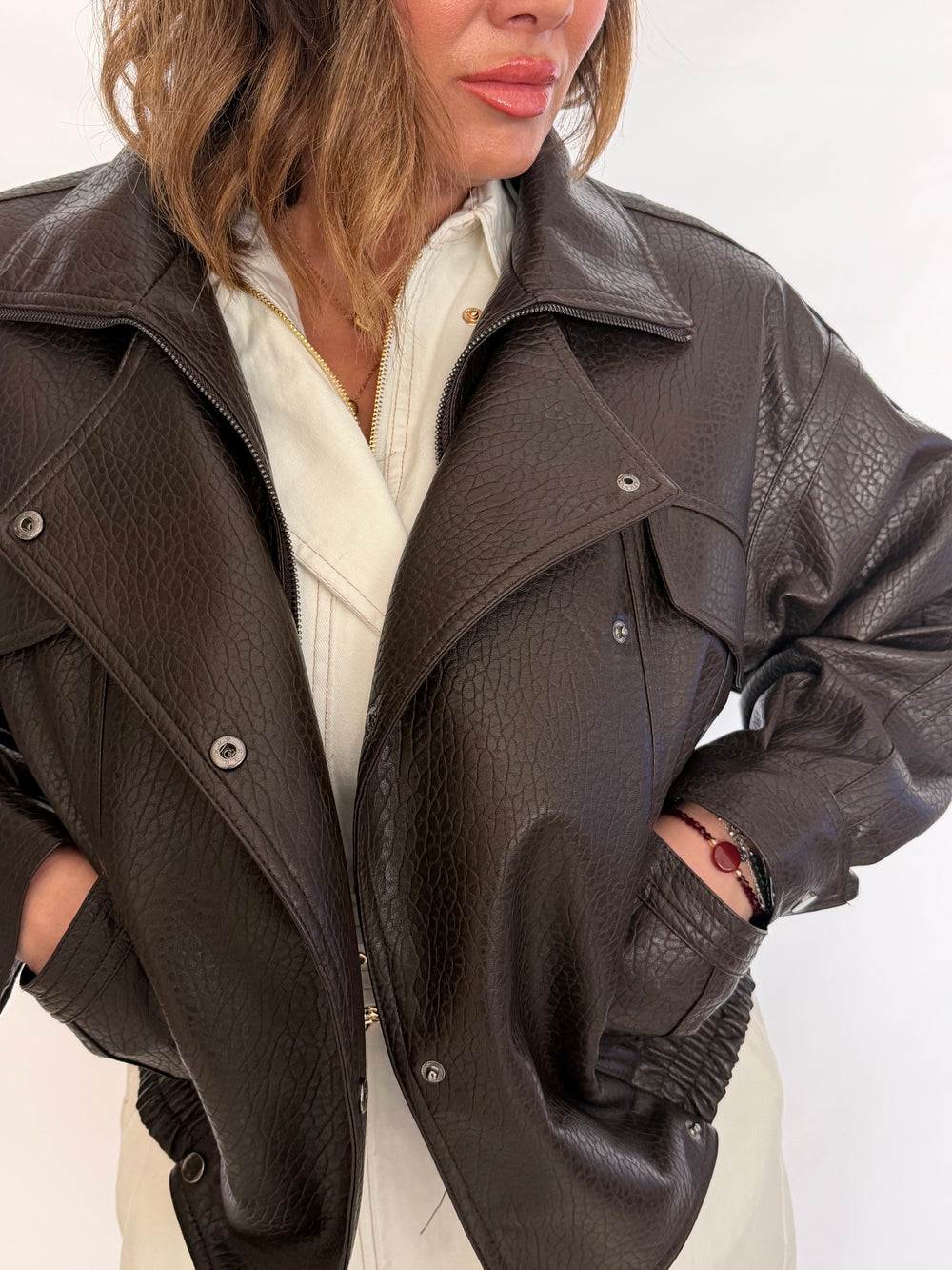 Giubbino seminpelle col marrone con colletto e bottoni, modello leggermente oversize.E' una tg unica veste fino ad una tg 48.