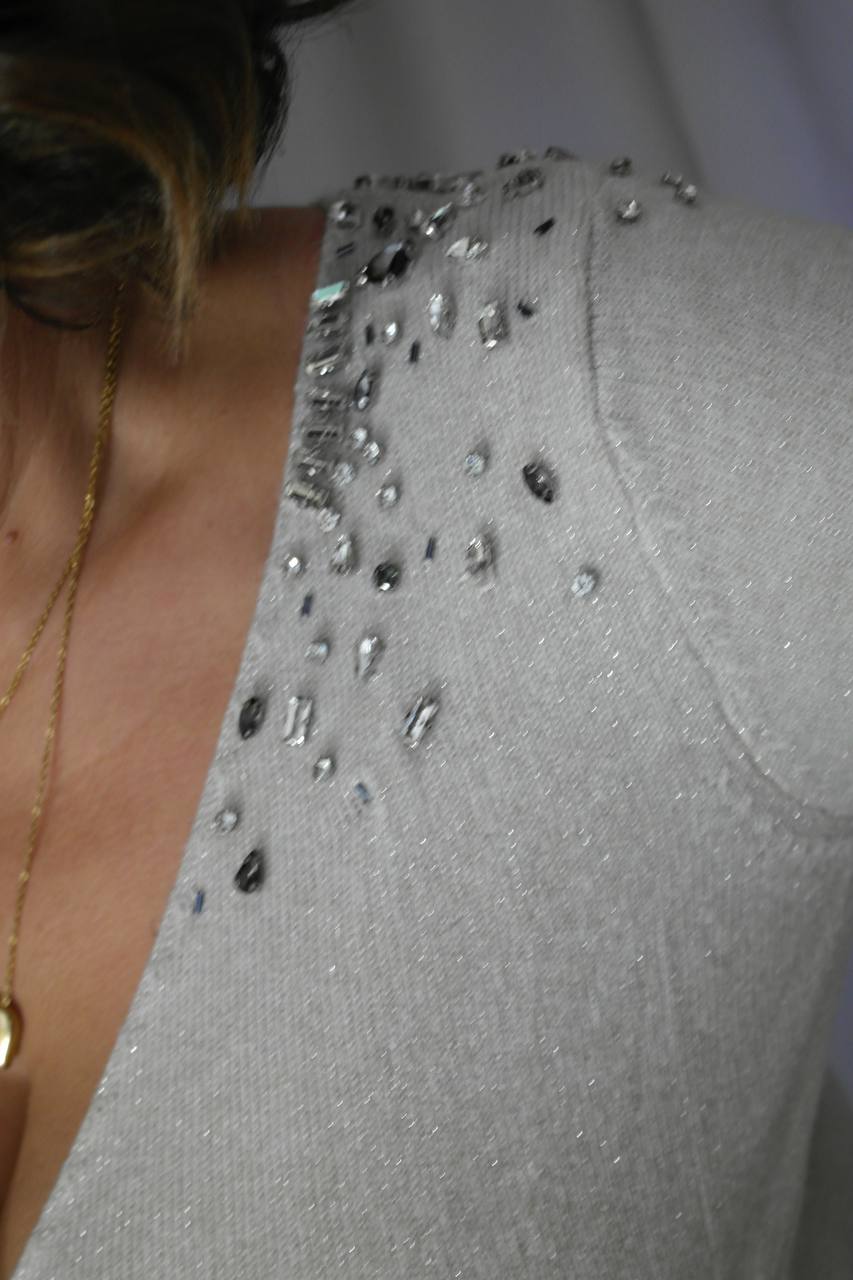 Maglia laminata con dettagli pietre swaroski sulle spalle e sul davanti della maglia.Scollo ad incrocio. E'una tg unica ,veste fino ad una tg 48.