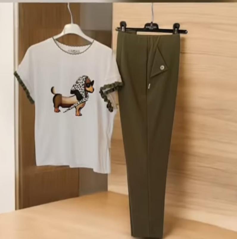 Maglia puro cotone ,stampa bassotto,colore bianca e dettagli sulla manica in verde