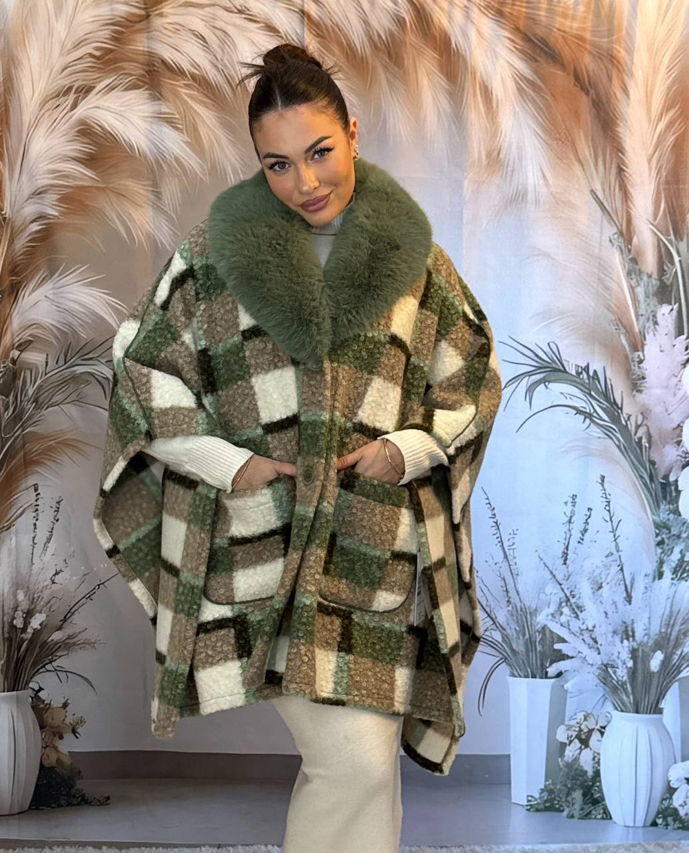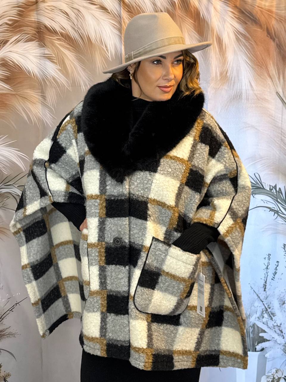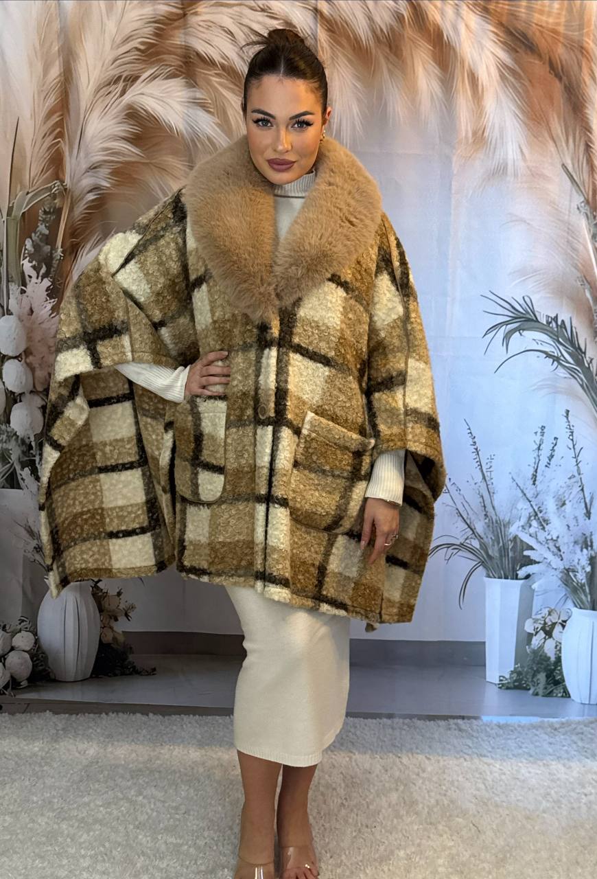Mantella a quadri in lana con abbottonatura bottoni ,e collo pelliccia .E' una taglia unica veste fino ad una taglia 52.
