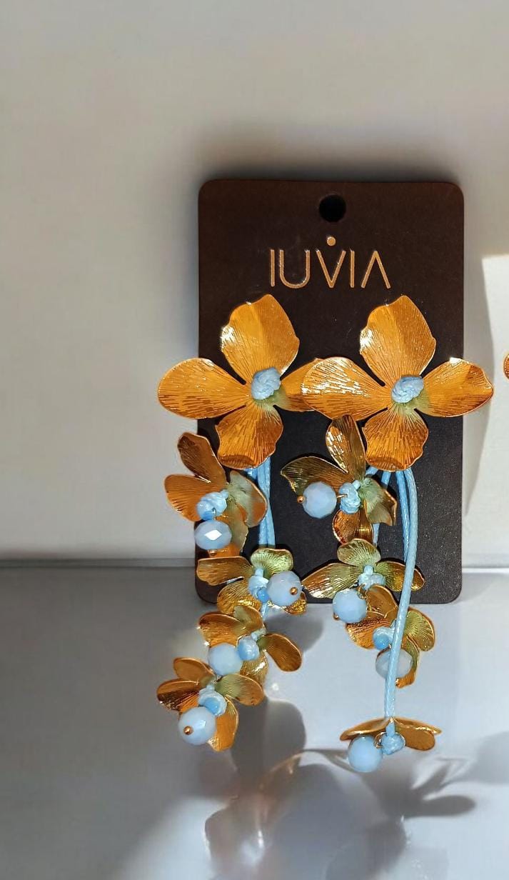 Orecchini Andrea con foglia in acciaio col oro corda colorata in azzurro.