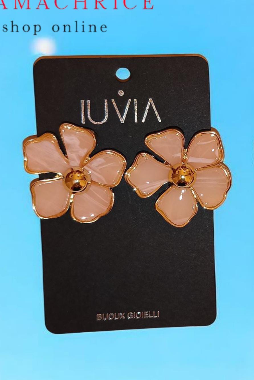 Orecchini forma fiore in acciaio col oro e fiore interno rosa perlato.