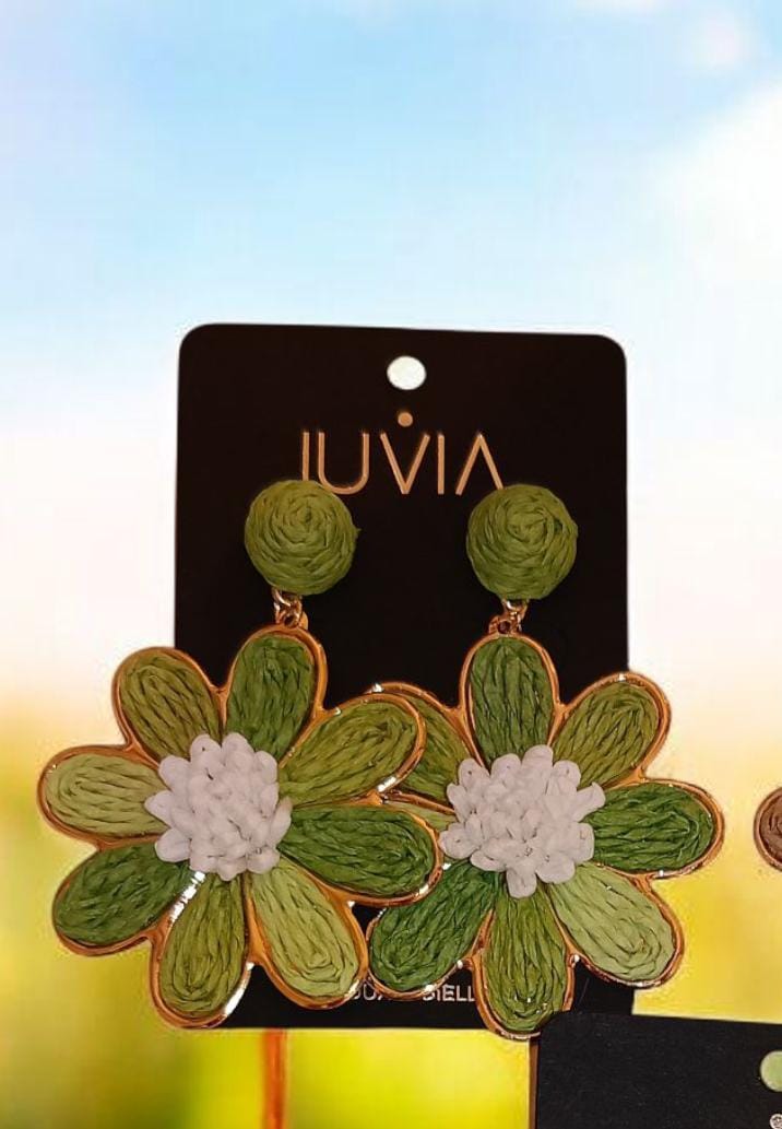 Orecchini in rafia colorata,forma fiore margherita in un tris di colori nella variante del verde.gancio in acciaio.