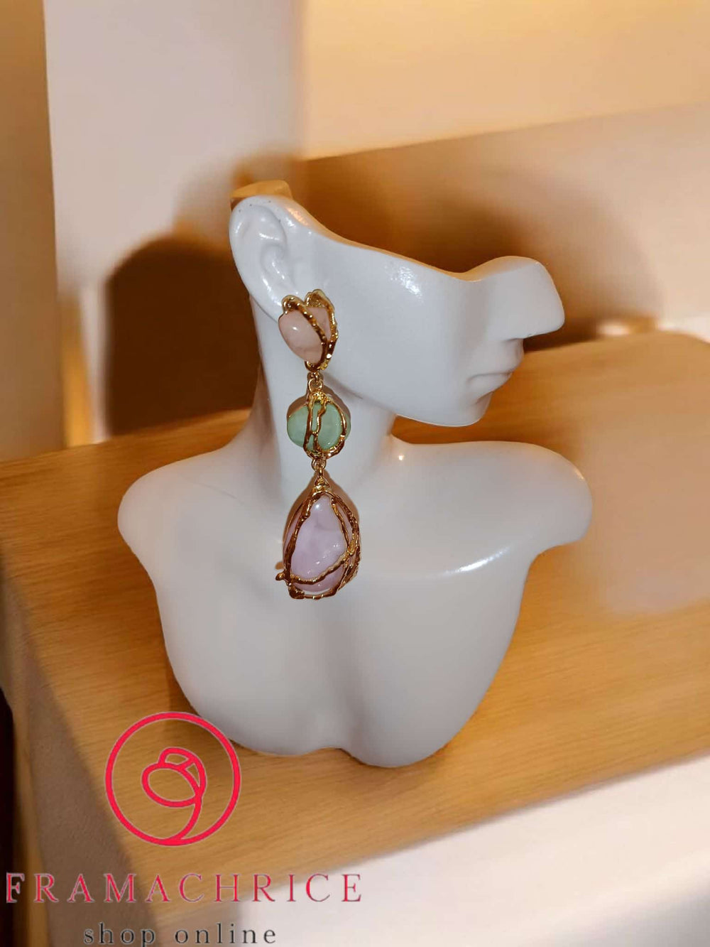Orecchini realizzato in acciaio col oro e al suo interno pietre colorate tra il rosa,verde menta e glicine.