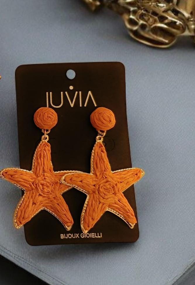 Orecchini pendenti,in rafia colorata forma stella nella variante dell'arancio.Gancio in acciaio.