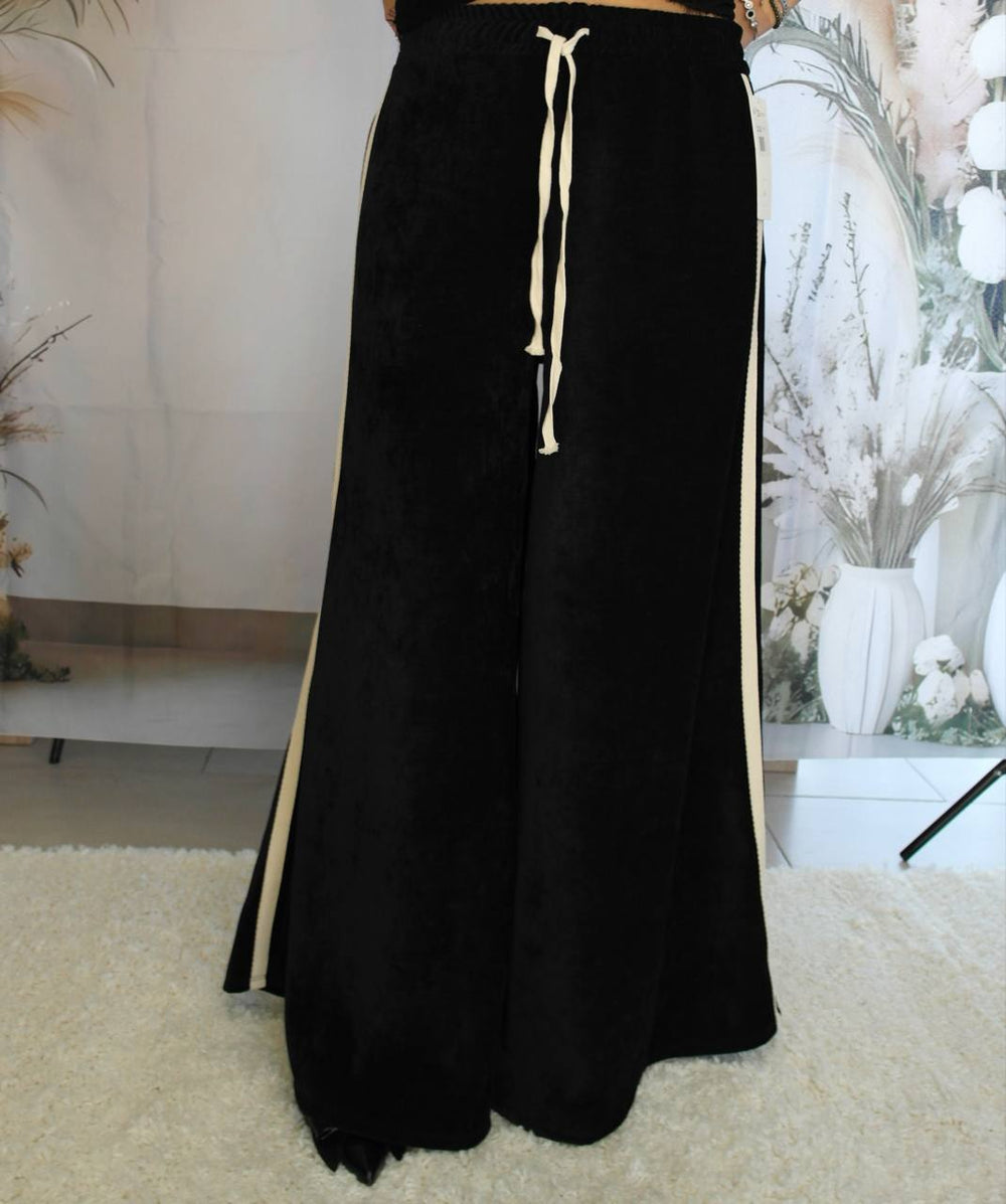 Pantapalazzo elastico in vita con laccetto,tessuto velluto a costine strette,e bande laterali mod.adidas. e' una taglia unica ,veste fino ad una 46.